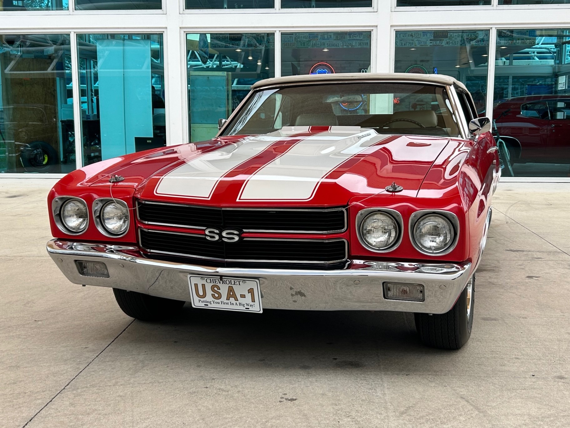 This 1970 Chevrolet Chevelle SS 454 LS5 Convertible stands as a rare and remarkable example of American muscle car heritage. Featuring the powerful #512 block 454 cubic inch V8 engine, it boasts a 4-speed manual transmission and a 12-bolt rear end. The striking red exterior with white SS stripes, complemented by a pristine white convertible top, makes it a head-turner.