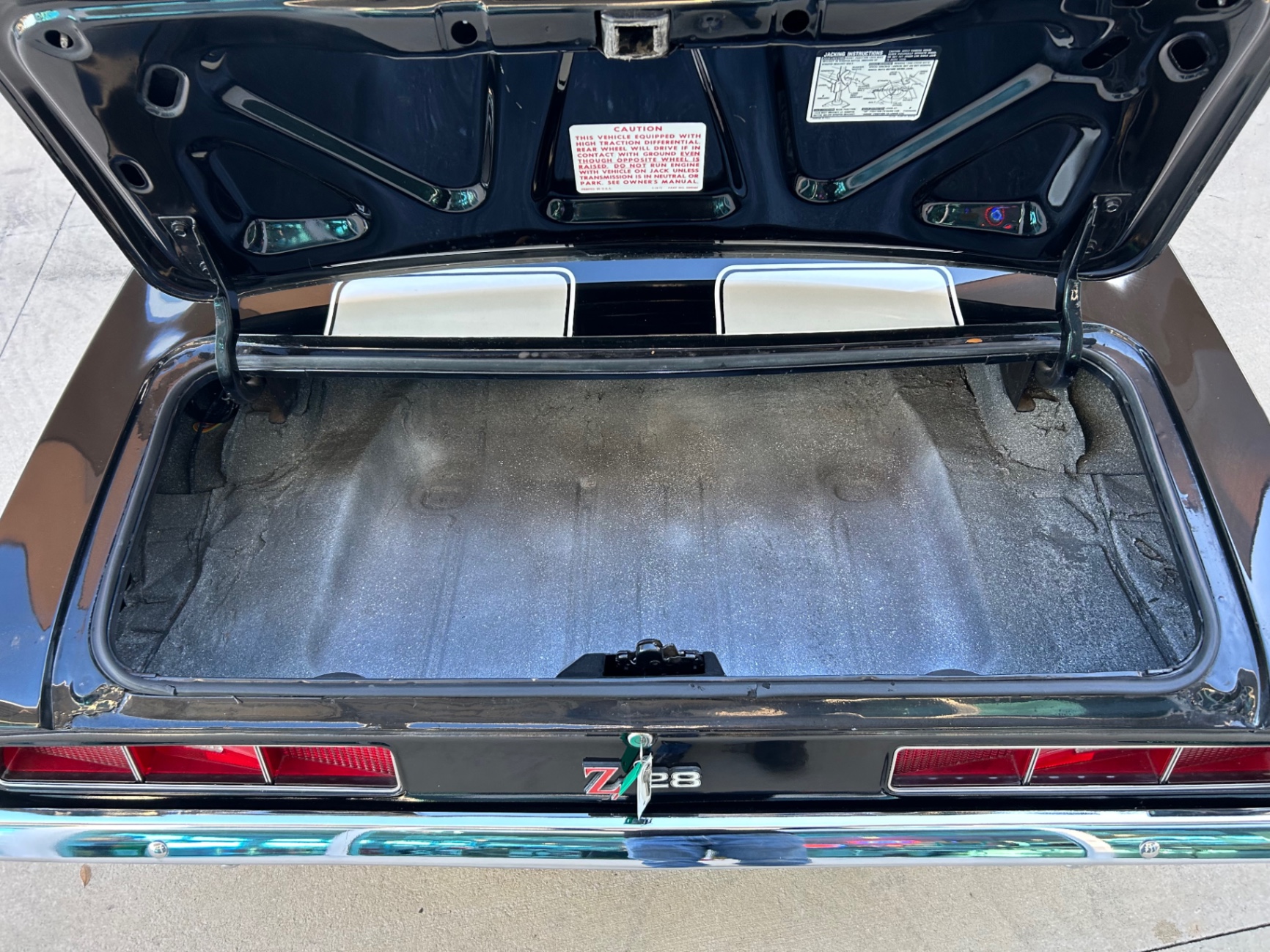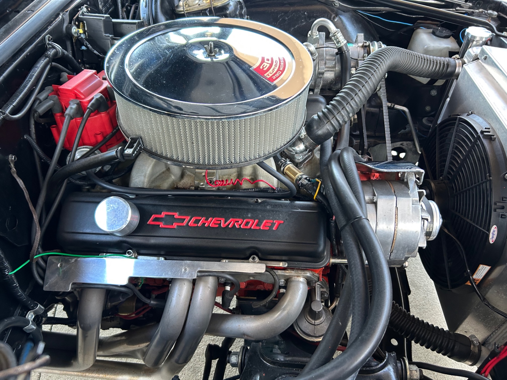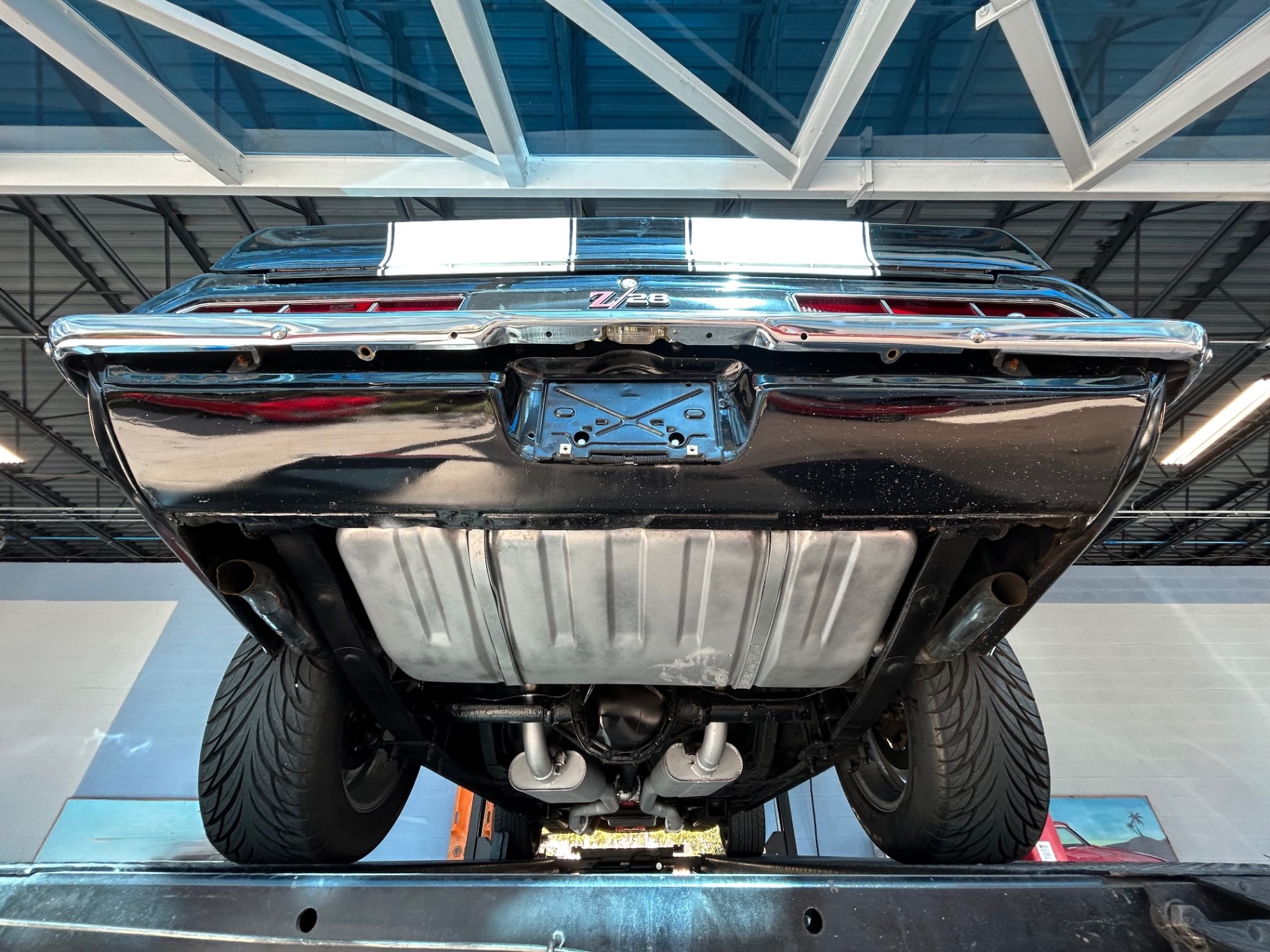 The 1969 Camaro Z28 Black Tribute stands out with its sleek black paint and contrasting white Z28 stripes, making a bold statement on the road. Beneath the hood lies a 350 cubic inch engine, paired with a 4-speed automatic transmission that delivers a smooth driving experience. The engine bay showcases performance enhancements, including an aluminum manifold and black tube headers, complemented by a chrome open air cleaner with a distinctive red decal.