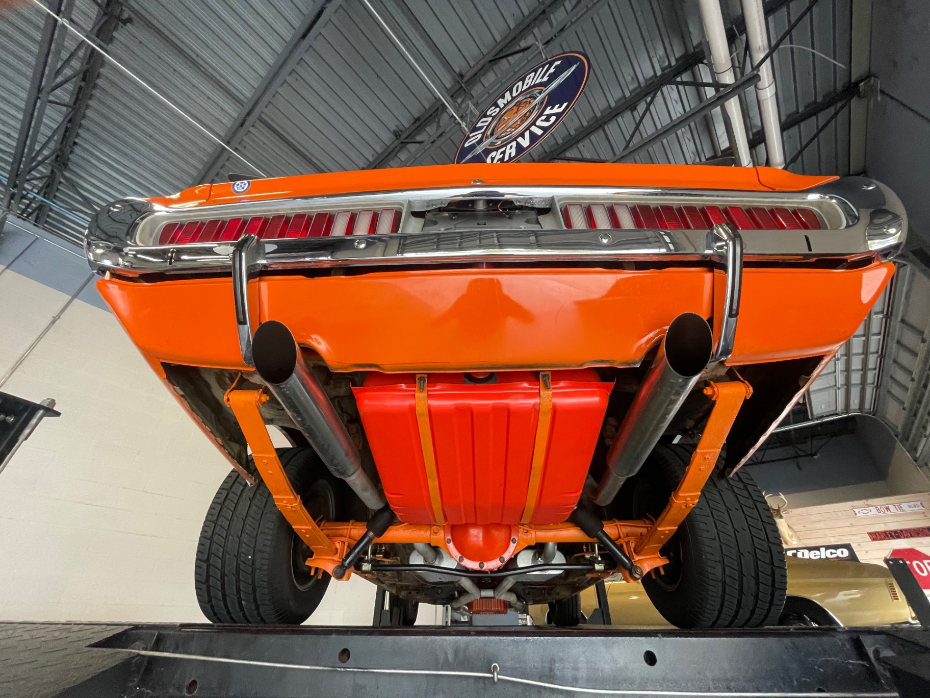 The Charger’s exterior features a striking orange paint with black racing stripes, a power-bulge hood with 340 Magnum emblems, and a black rear wing. It sits on period-correct Keystone mag wheels wrapped in Mickey Thompson Sportsman GT raised white letter tires, which add to its aggressive stance.