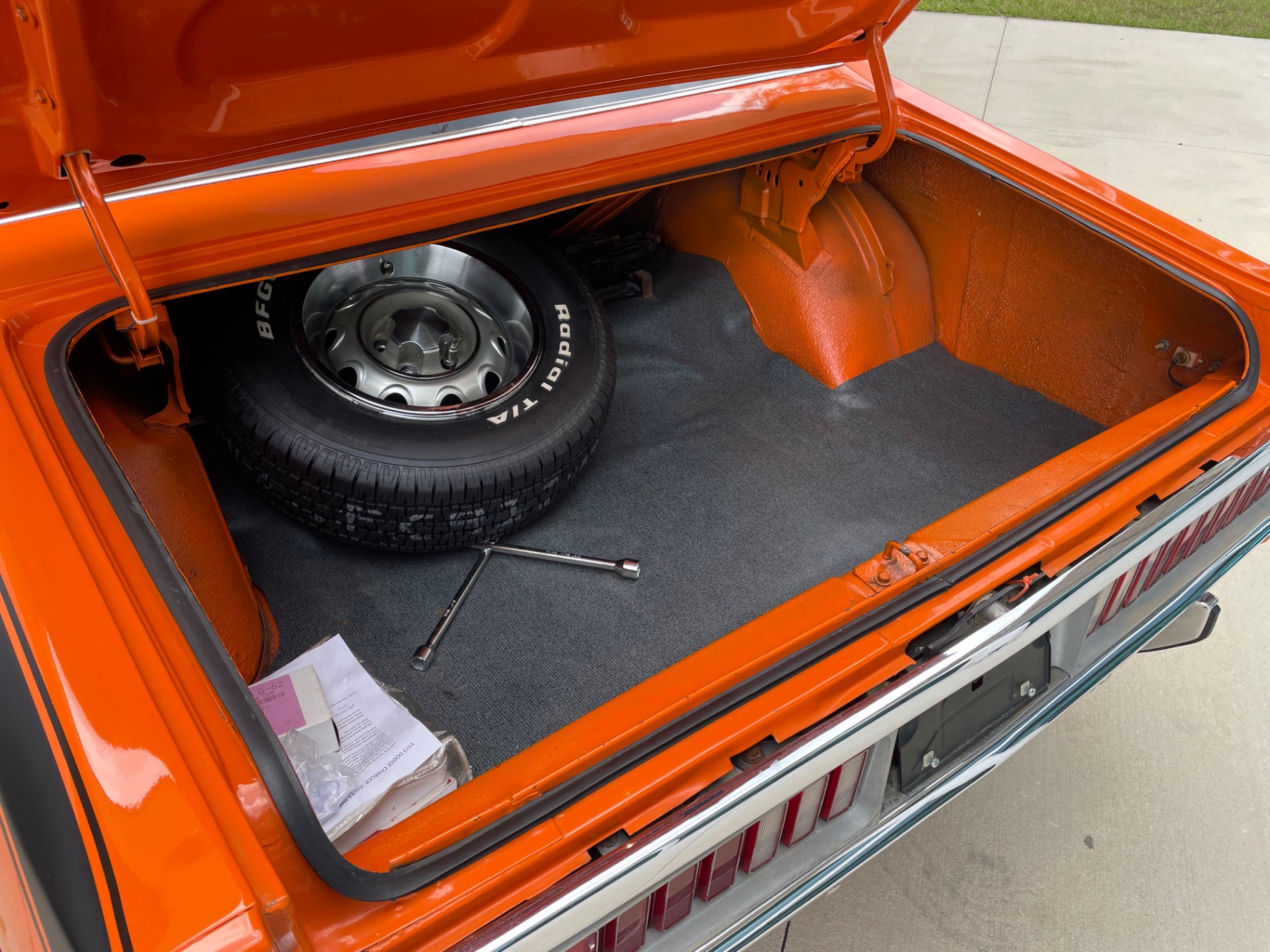 Inside, the cockpit blends sportiness with luxury, featuring twin black and orange bucket seats, a wood-trimmed dashboard, factory gauges, an aftermarket tachometer, and a factory AM/FM radio. The interior is complemented by a 3-spoke steering wheel, wood-handled automatic shifter, and air conditioning, enhancing driving comfort. The trunk includes a correct mat and spare tire. This Charger offers a classic look and feel of 1970s Mopar muscle, delivering both style and performance.